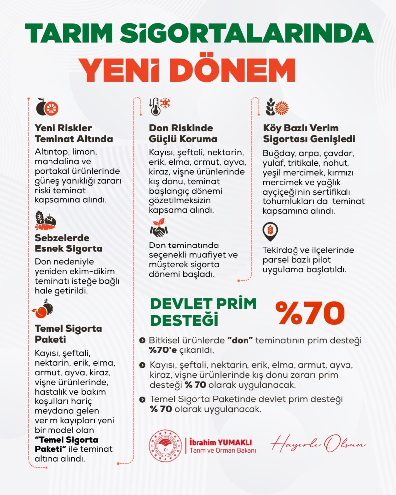 Bakan Yumaklı, açıklamasında özellikle don riskine karşı alınan yeni önlemlere dikkat çekti. İklim değişikliğinin tarımsal üretim üzerindeki olumsuz etkilerinin her geçen yıl arttığını belirten Yumaklı, bu kapsamda don teminatı ile Temel Sigorta Paketi kapsamında devlet prim desteğinin yüzde 70 seviyesine yükseltildiğini açıkladı. Bu önemli artışın, üreticinin omuzlarındaki mali yükü ciddi oranda hafifleteceğini kaydeden Yumaklı, devletin çiftçinin yanında olmaya devam edeceğini söyledi.