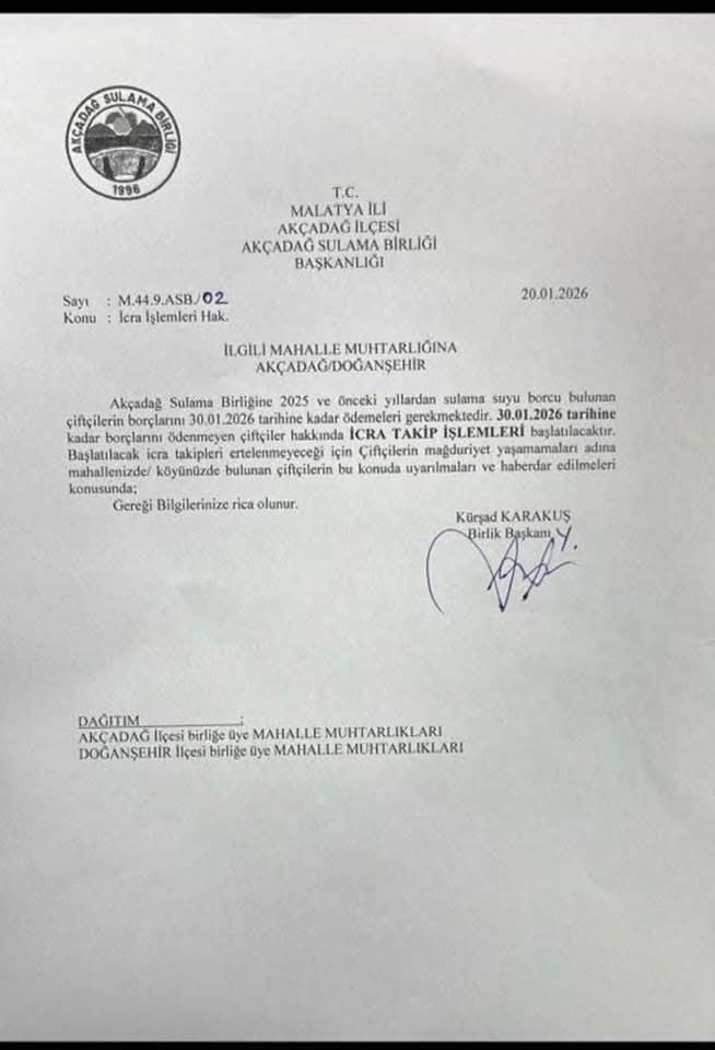 Geçtiğimiz günlerde gündeme taşıdığımız sulama birlikleri meselesi, Akçadağ Sulama Birliği’nin mahalle muhtarlıklarına gönderdiği son yazıyla birlikte adeta çiftçinin kader belgesine dönüştü. Yazıda, 2025 ve önceki yıllara ait sulama suyu borçlarını ödeyemeyen çiftçiler hakkında 30 Ocak 2026 itibarıyla icra takip işlemlerinin başlatılacağı açıkça ifade ediliyor. Üstelik “ertelenmeyecek” vurgusuyla…