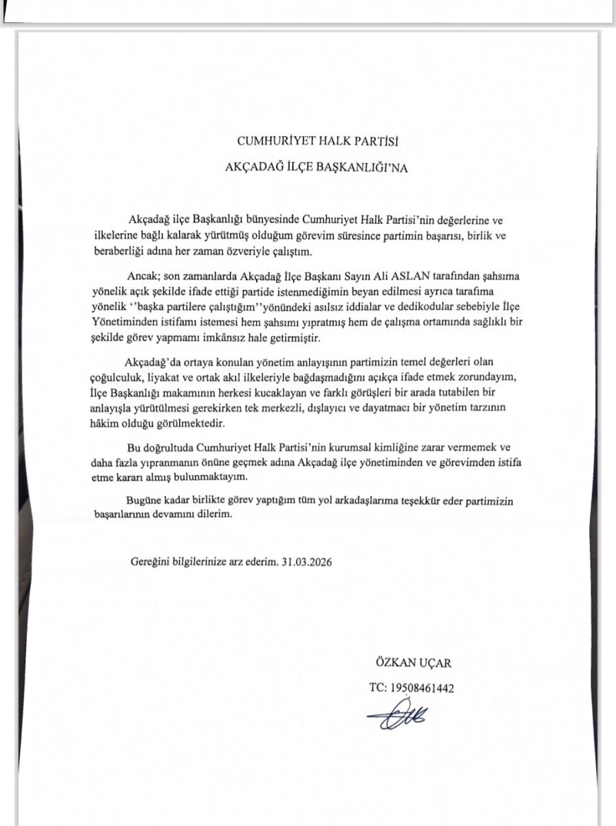 ​Özkan Uçar’ın onurlu duruşuyla verdiği bu istifa, Akçadağ CHP’de bir devrin kapanması gerektiğinin sinyalidir. Kendi başarısızlıklarını, çalışkan isimleri karalayarak gizlemeye çalışanların, Cumhuriyet Halk Partisi’nin geleceğinde yeri olmamalıdır. Halk, icraat beklerken dedikodu üreten; birleştirici olması gerekirken bölücülük yapan bir yönetim anlayışı, tarih önünde de halk önünde de mahkum olacaktır.